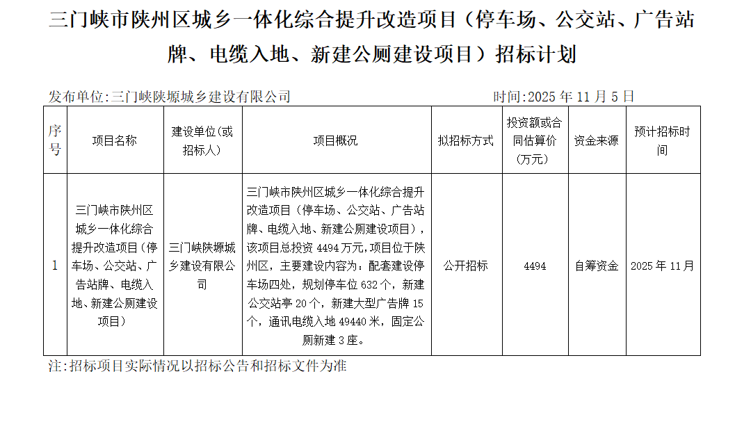 三门峡市陕州区城乡一体化综合提升改造项目(停车场、公交站、广告站牌、电缆入地、新建公厕建设项目)招标计划