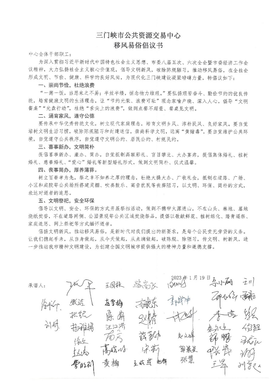 活动伊始,中心王晓燕同志向大家讲述了生活中仍存在的大操大办、恶俗婚闹、高额彩礼、厚葬薄养、不文明祭扫等不良习俗以及它们的危害,宣传勤俭节约、文明健康的生活理念,呼吁干部职工争做移风易俗的带头人,坚决抵制大操大办,提倡红白事喜事从简,破除陈规陋习。党员干部要以身作则、示范带头,群众才会积极响应,每个人自觉抵制不良风气,陈规陋习便会失去生存土壤,文明新风就会吹遍广袤的中国大地。最后,中心全体干部职工签署移风易俗倡议书,承诺在以后的工作生活中,严格要求自己,遵守承诺,做移风易俗、勤俭节约、新事新办的表率,树立榜样,管好自己、带好亲属、影响他人,自觉做移风易俗的宣传者、倡导者、传播者。